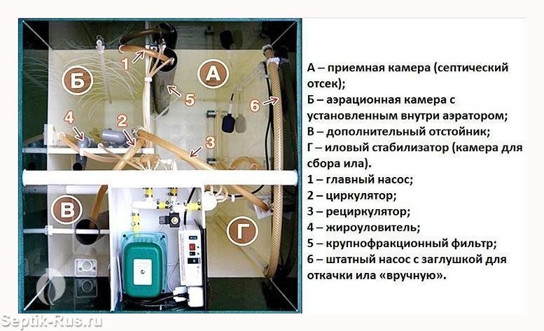 Хозяйственно-бытовые сточные воды поступают в приемную камеру септика Астра 4, которая служит для усреднения стоков по качественному составу и позволяет принять залповый сброс объемом 180 литров, не нарушая режима работы станции. Кроме того, содержащийся в уравнительном резервуаре активный ил взаимодействует с органическими загрязнениями – так начинается первичная биологическая очистка сточных вод. Кроме того в уравнительном резервуаре происходит задержка и накопление мусора, взвешенных веществ и им подобных загрязнений.