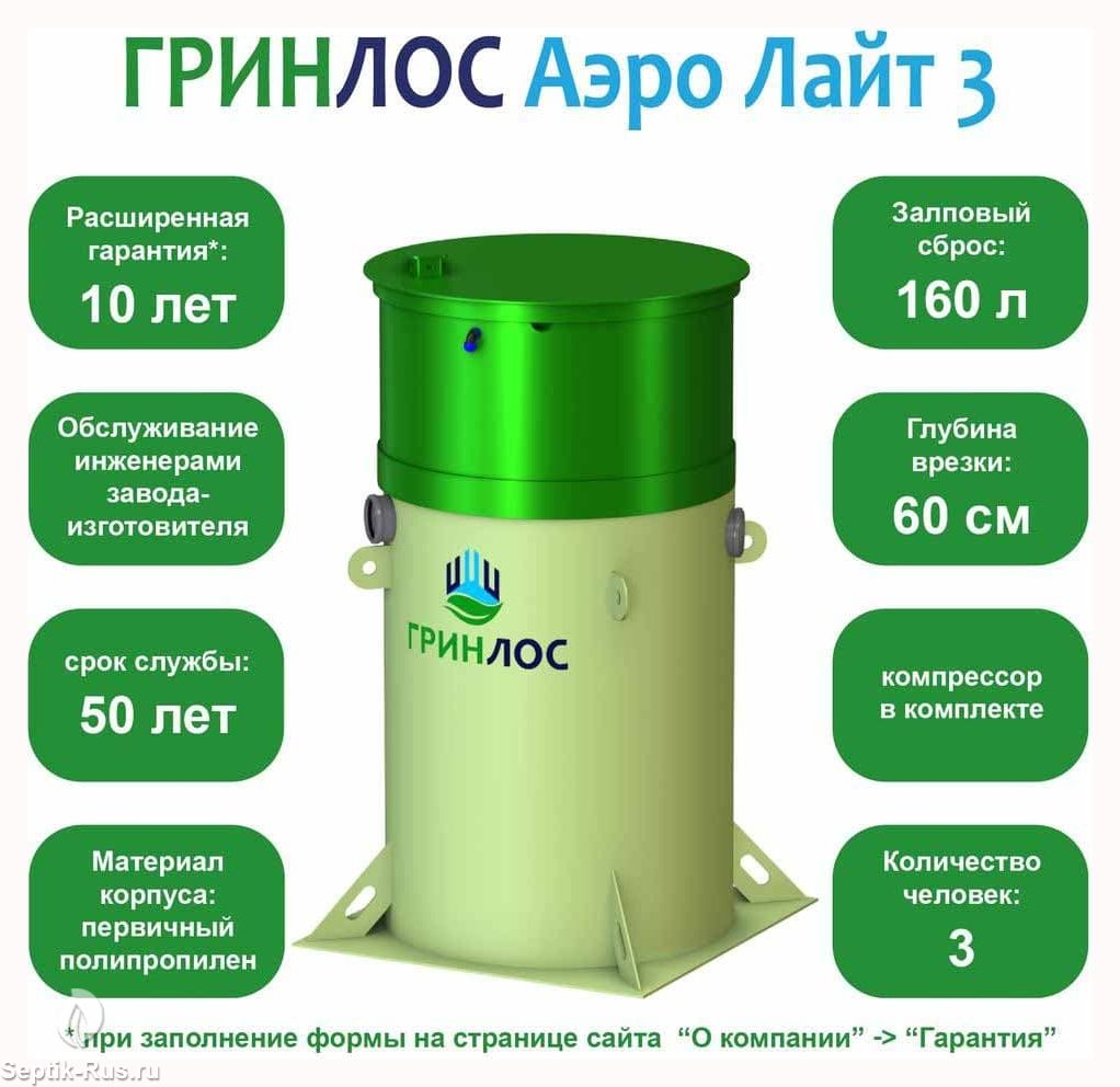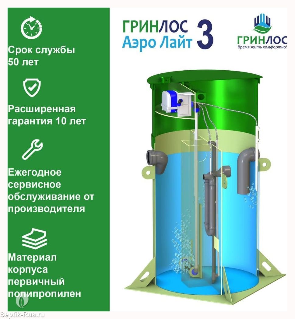 Станция Биологической Очистки Гринлос Аэро Лайт 3 предназначены для расщепления и переработки основных органических загрязнений, содержащихся в бытовых сточных водах. Эти процессы происходят в результате жизнедеятельности аэробных микроорганизмов, условия для жизнедеятельности которых создает септик.