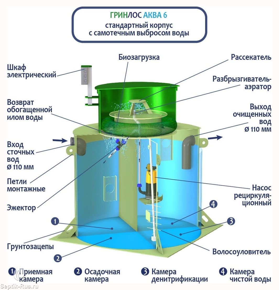 Процесс расщепления и переработки органических загрязнений происходят в результате жизнедеятельности аэробных микроорганизмов, условия для жизнедеятельности которых создает септик ГРИНЛОС Аква 6.